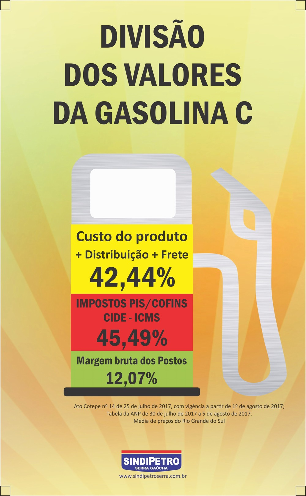 Você conhece a divisão dos valores da gasolina? Sabe qual o custo do produto e dos impostos? Nós queremos esclarecer para você. No final da semana passada o governo federal anunciou o aumento de impostos que incidem nos combustíveis, provocando uma desaceleração na economia e elevação de preços. O Sindipetro Serra Gaúcha e outros sindicatos do setor prepararam uma campanha contra essa medida do governo, que terá impacto direto no bolso de todo o cidadão brasileiro.